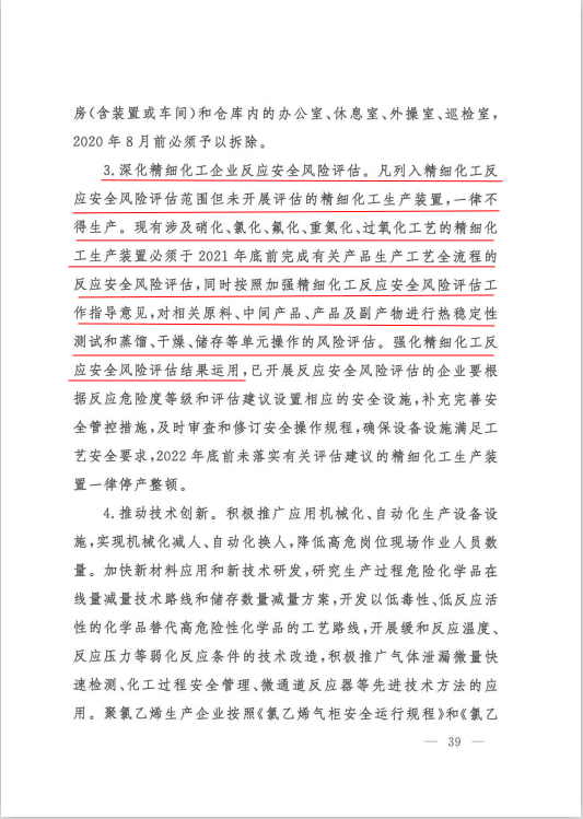 《國(guó)務(wù)院安全生產(chǎn)委員會(huì)關(guān)于印發(fā)〈全國(guó)安全生產(chǎn)專項(xiàng)整治三年行動(dòng)計(jì)劃〉的通知》(安委[2020]3號(hào))文件指出“深化精細(xì)化工企業(yè)反應(yīng)安全風(fēng)險(xiǎn)評(píng)估。凡列入精細(xì)化工反應(yīng)安全風(fēng)險(xiǎn)評(píng)估范圍但未開(kāi)展評(píng)估的精細(xì)化工生產(chǎn)裝置,一律不得生產(chǎn)?,F(xiàn)有涉及硝化、氯化、氟化、重氮化、過(guò)氧化工藝的精細(xì)化工生產(chǎn)裝置必須于2021年底前完成有關(guān)產(chǎn)品生產(chǎn)工藝全流程的反應(yīng)安全風(fēng)險(xiǎn)評(píng)估,同時(shí)按照加強(qiáng)精細(xì)化工反應(yīng)安全風(fēng)險(xiǎn)評(píng)估工作指導(dǎo)意見(jiàn),對(duì)相關(guān)原料、中間產(chǎn)品、產(chǎn)品及副產(chǎn)物進(jìn)行熱穩(wěn)定性測(cè)試和蒸餾、干燥、儲(chǔ)存等單元操作的風(fēng)險(xiǎn)評(píng)估。強(qiáng)化精細(xì)化工反應(yīng)安全風(fēng)險(xiǎn)評(píng)估結(jié)果運(yùn)用……”